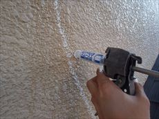 充填したコーキングをヘラを使用して空気を抜くように丁寧に仕上げていきます。 |