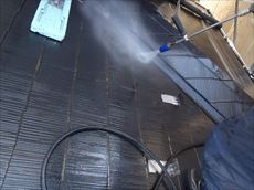 屋根の汚れを高圧洗浄機を使って落としていきます。汚れのひどい場合にはトルネードという部材を使うなど状況によって使い分けます。 |