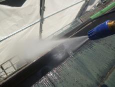 | 高圧洗浄で屋根の汚れを落としています。 | シートを用意し、洗浄の水が飛散するのを防止します。 | 非塗装部分も高圧洗浄でキレイになりました。 |