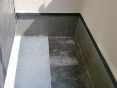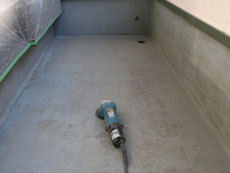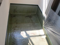 | ベランダ下地調整を行います。 | 下塗り材を塗布します。 | ガラスマットを貼り付けます。 |