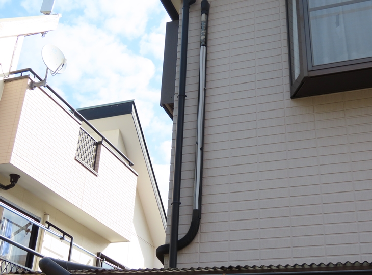 屋根、外壁、破風板、鼻隠し、軒天井、軒樋、竪樋、出窓天板屋根、水切り、玄関扉、物置扉、勝手口庇、雨戸、ガス管、エアコンスリムダクト |