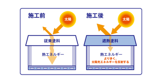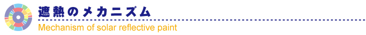 | 一般的な塗料は太陽光のエネルギーを吸収して発熱しますが、遮熱塗料は、太陽光エネルギーを有効に反射して、屋根や外壁の温度上昇を抑制し、室内の温度上昇を緩和し冷暖房効率を抑える環境改善(地球温暖化によるヒートアイランド対策)を目的とした「省エネ塗料」です。 太陽の光のエネルギーは、屋根に当たって熱エネルギーへと変化し、屋根の温度を上昇させます。 遮熱塗料とは、この太陽の光を多く反射させることで温度の上昇を抑える性能がある塗料のことを言うのです。 |