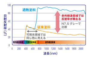 屋根の上昇温度をストップ!遮熱塗料の役割は、太陽光による赤外線をしっかりと反射させること。 右のグラフは、同じ色の従来塗料と遮熱塗料の反射率を比べたものです。 遮熱塗料はより多くの赤外線を反射するため、その分の熱エネルギーの吸収を抑え、屋根の温度上昇を防ぐ効果があるのです。 |