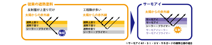 | 従来の遮熱塗料は、上塗りのみの場合と、中塗りと上塗りの場合が一般的でした。 しかし、前者は反射性能を上塗りのみに頼ってしまうという問題点が、後者は一工程増加することで、コストや工期に負荷をかけてしまうという問題点がありました。 そこでサーモアイシリーズでは、反射率を向上させるため、下塗りにも高い反射性能をプラスしました。 また上塗りには「赤外線透過混色」という新技術を採用。 上塗りの反射性能をさらに向上させただけでなく、上塗り層で反射できない赤外線をなるべく吸収させずに透過させることで、下塗りの反射性能を最大限に発揮します。 上塗り、下塗りの塗膜全体で遮熱効果を発揮することで、日射反射率を向上させています。 |