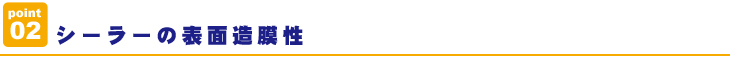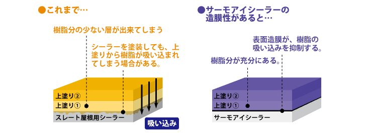 | シーラー・プライマーともに、造膜性を持ち、反射性能を有する下塗り材を開発しました。特にシーラーの造膜性は、従来タイプの浸透形シーラーと比べ、付着力と表面固化性の双方で優れており、上塗りの仕上がり向上に貢献します。 さらに、樹脂成分が吸い込まれやすいスレート基材の場合でも、シーラーの造膜性が樹脂の吸い込みを抑制するため、上塗りの吸い込みが抑制され、充分な塗膜性能発揮が可能となりました。 |