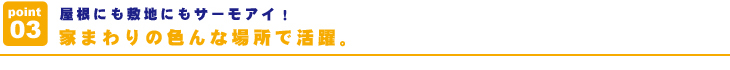 | サーモアイシリーズは、屋根部分はもちろん家まわりのさまざまな場所に塗ることができます。 例えば、玄関先に塗装すればペットや観葉植物にも安心。 屋上のコンクリートテラスに塗れば、小さなお子様も裸足で遊んでいただくことができます。 |