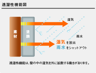 透湿性とは、住宅内部の湿気を外に排出する性質のこと。透湿性に優れ、外からの雨水を通しにくく内部からの余分な湿気を放出する理想的な塗料です
