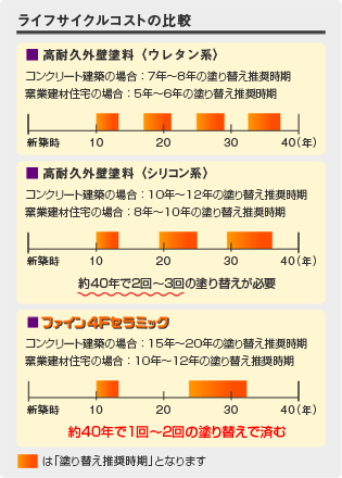 • 上記の塗り替え周期はあくまで概算であり、建物(住宅)の立地や形状、素材の性質によって異なります。