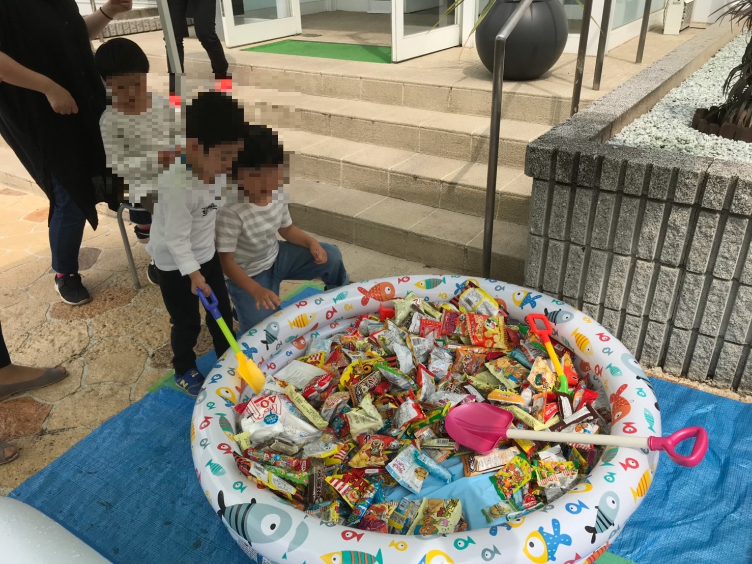 )お菓子つかみ取りでは、お子さんがスコップを使って一生懸命目当てのお菓子をすくって