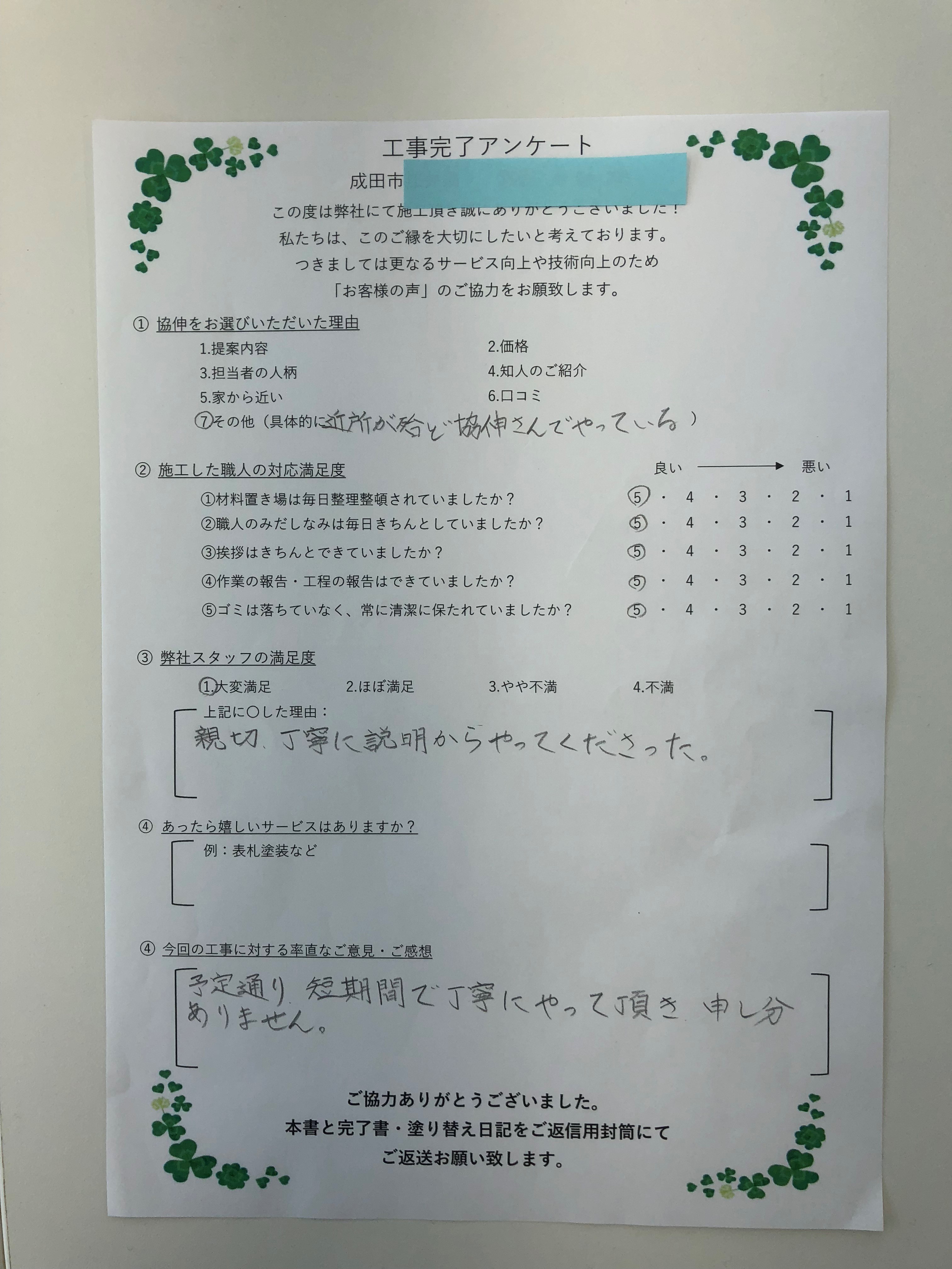 今日はうれしいアンケートを結果を頂きました。このような結果に甘んじることなく、今後もお客様に喜んでいただけるよう日々努力いたします。