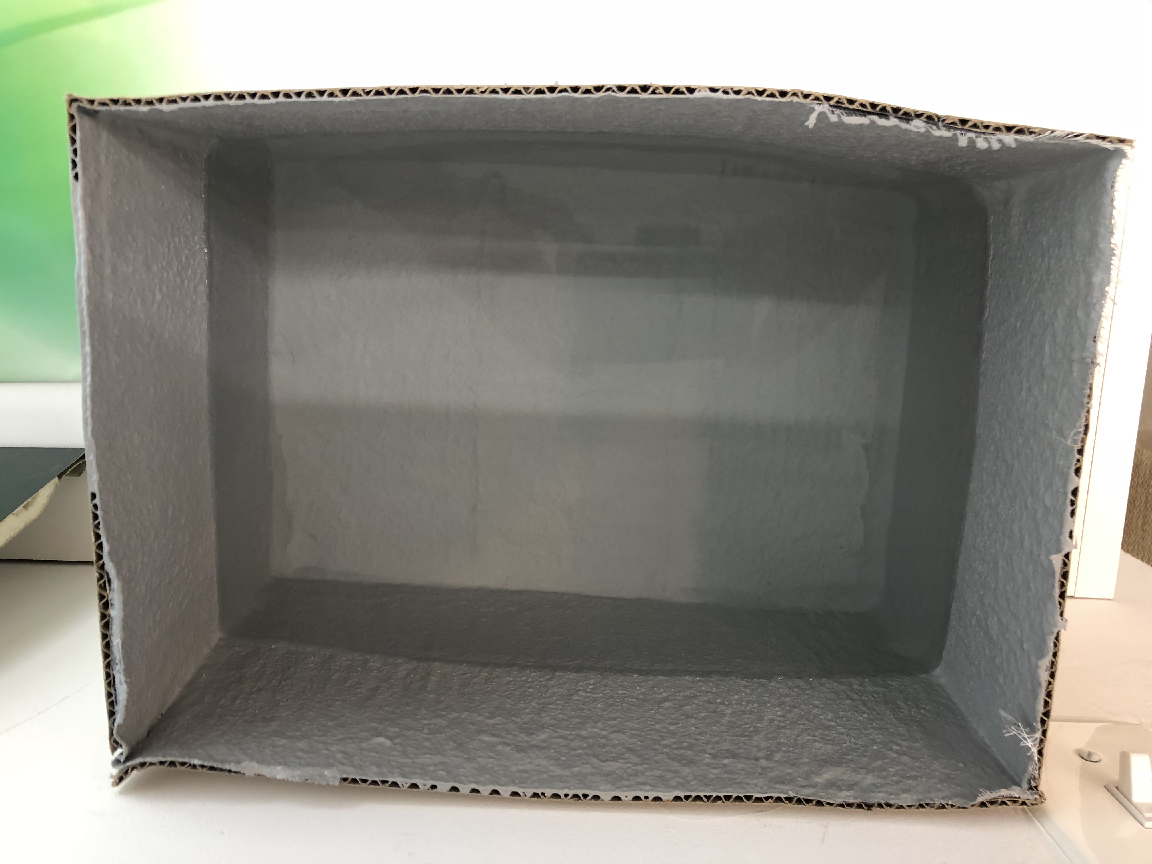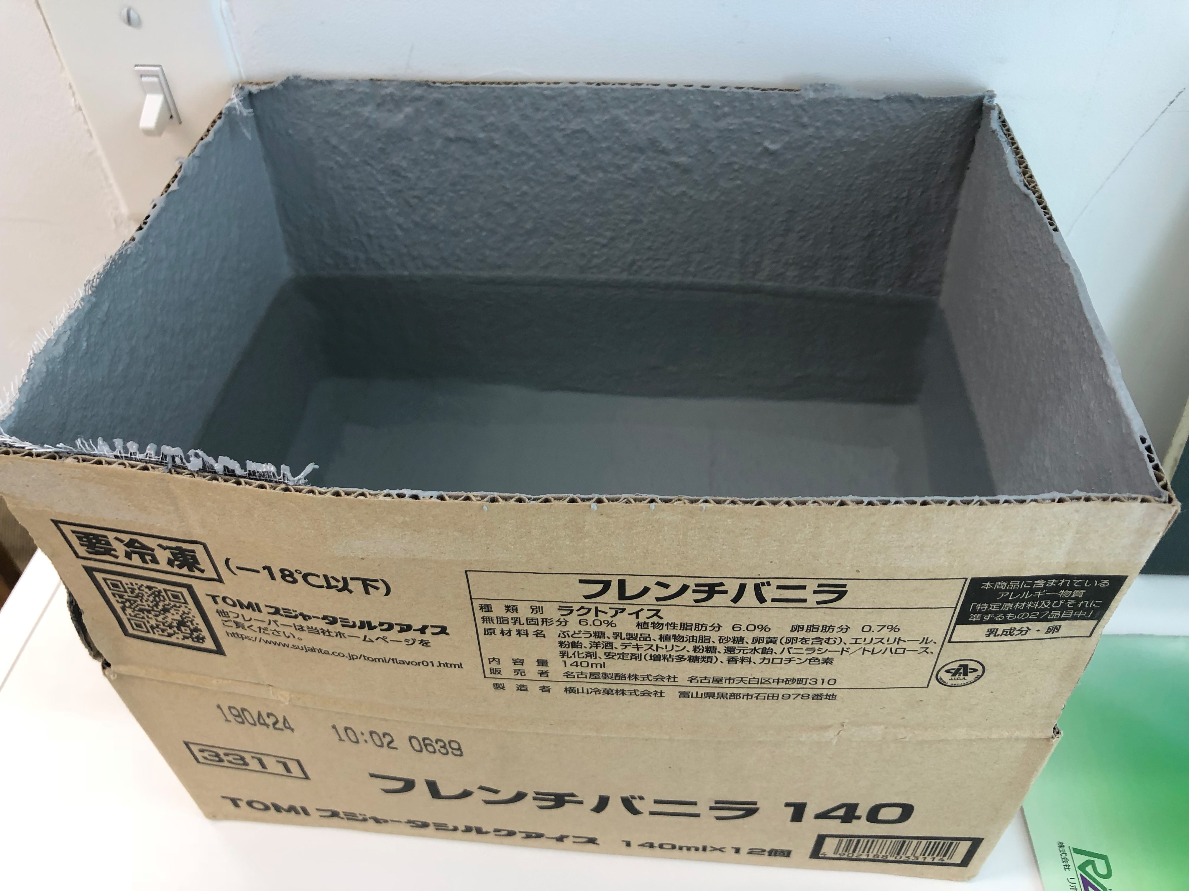 今日は防水の実験風景です。まず、底も塞いでいない段ボールの中に防水加工を施しました。