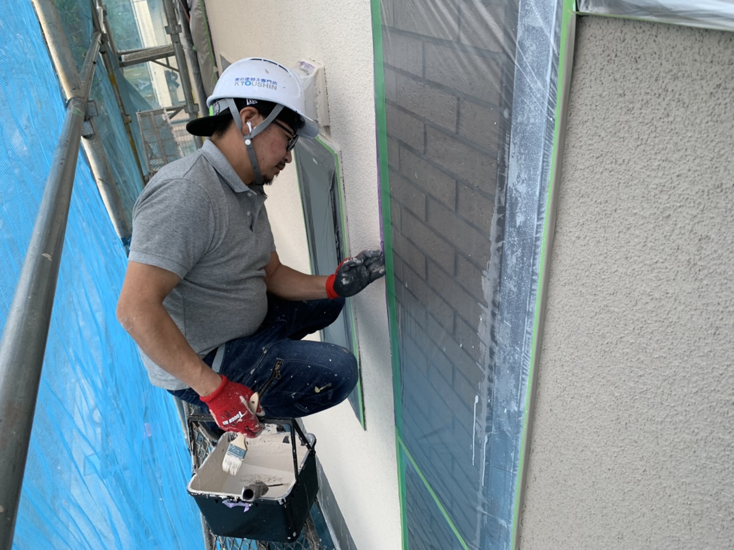 外壁とタイルの間をハケで、細部まで塗装をしていますね!!