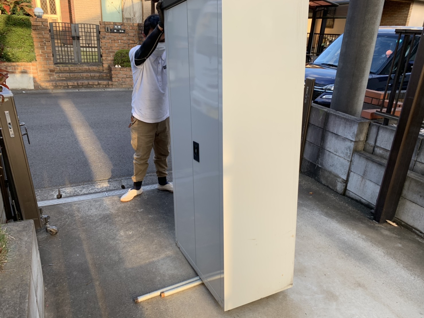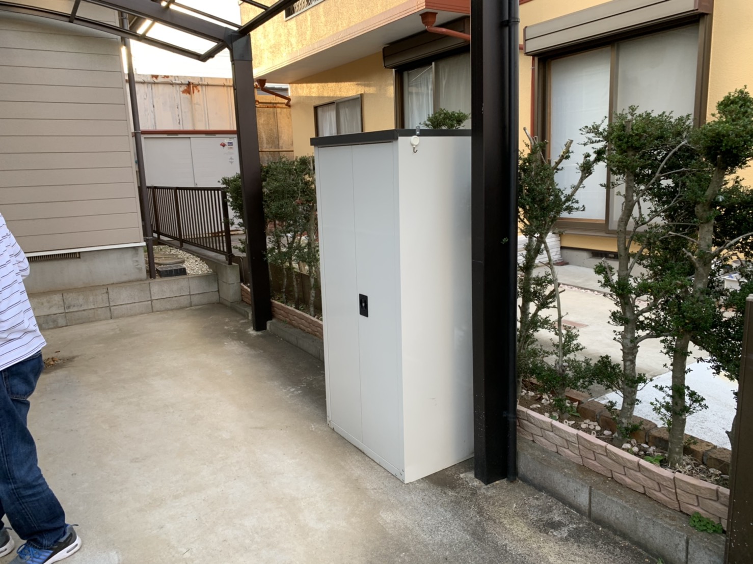 お家の廻りにある物置も動かして足場をスムーズに組めるように移動をしています