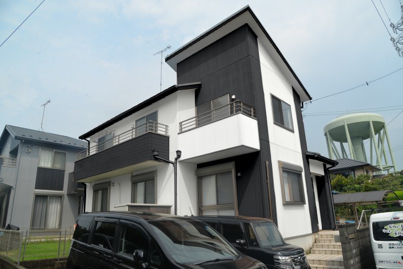 外壁はホワイト部分を残し木目調の部分をブラックにすることで高級感と落ち着きを演出しました!!