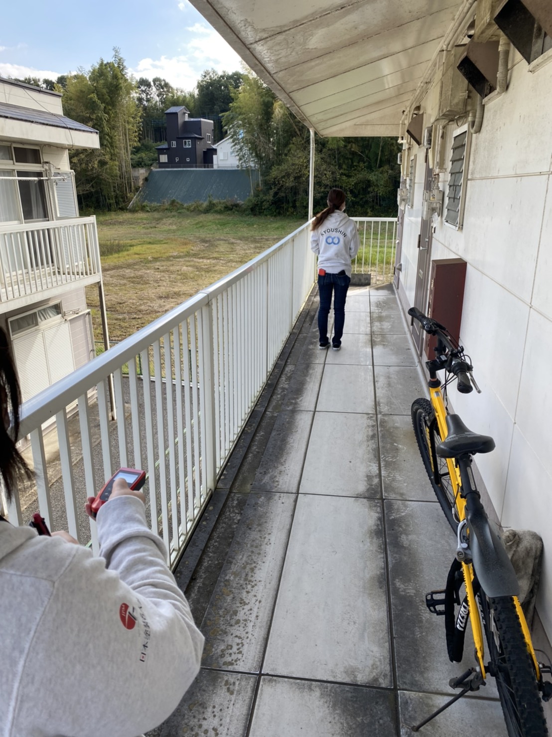 こちらはレーザー距離計を使い、建物の端から端までの計測をしています!