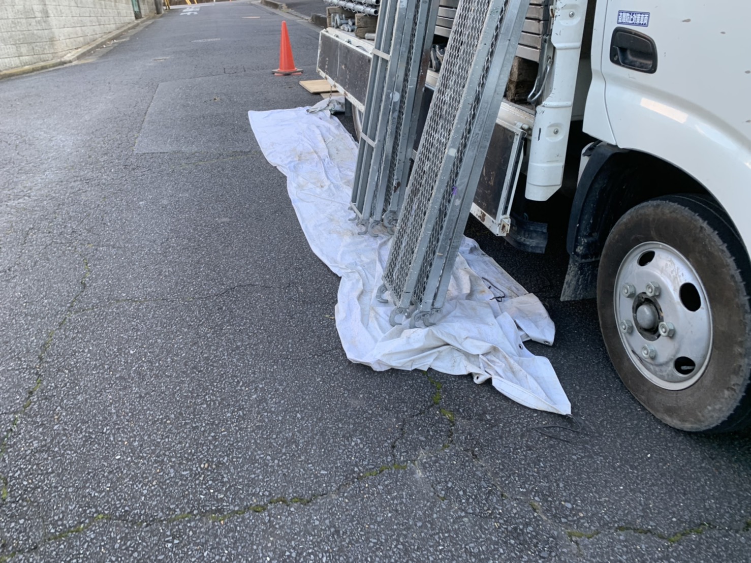 足場材の下に布を敷き置いています。
