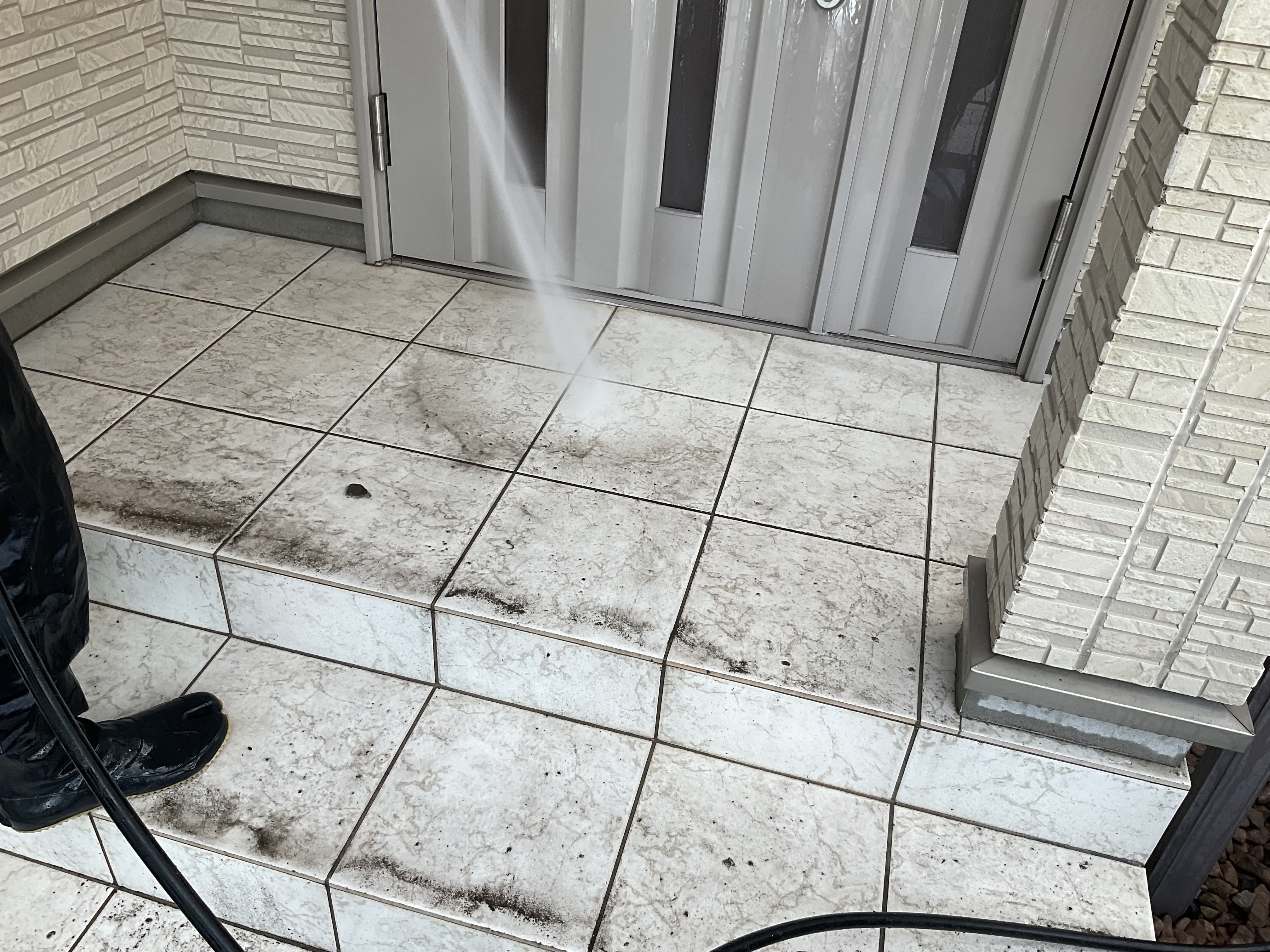 土間のタイルの泥を綺麗に洗い流していきます!