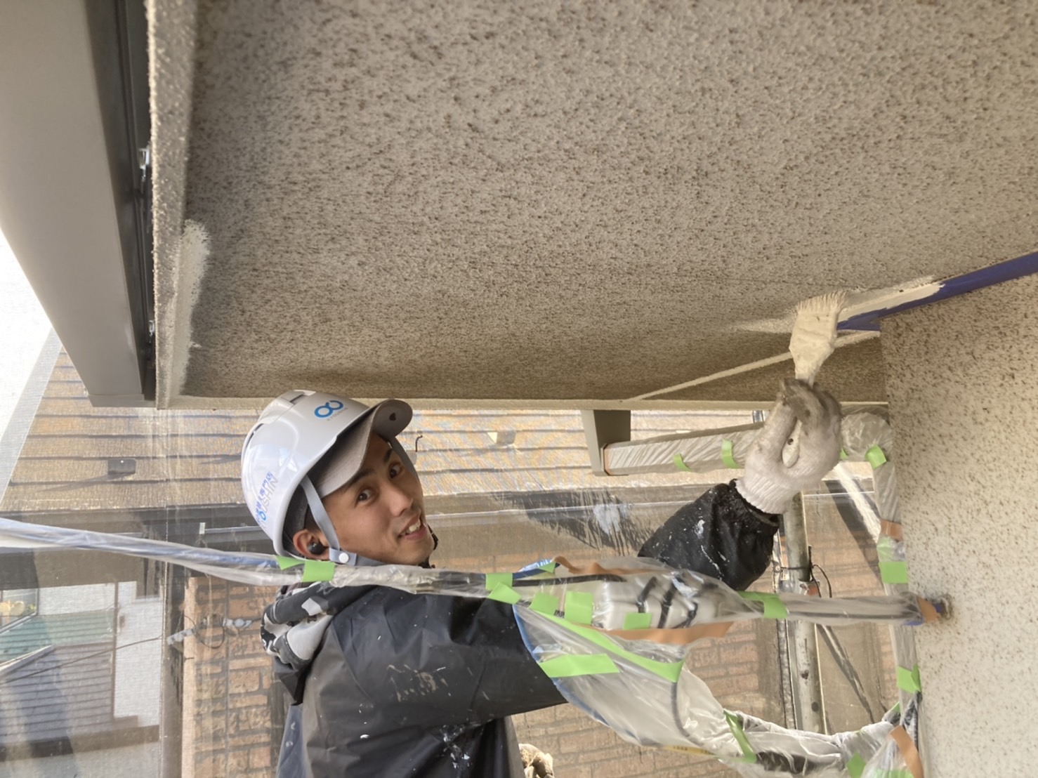 何故外壁の塗装なのにハケで塗装しているかと言いますとこういったタイル調の外壁ですとハケではどうしても塗料が入りにくい箇所が有るらしくハケでの塗装を行っているそうです!!
