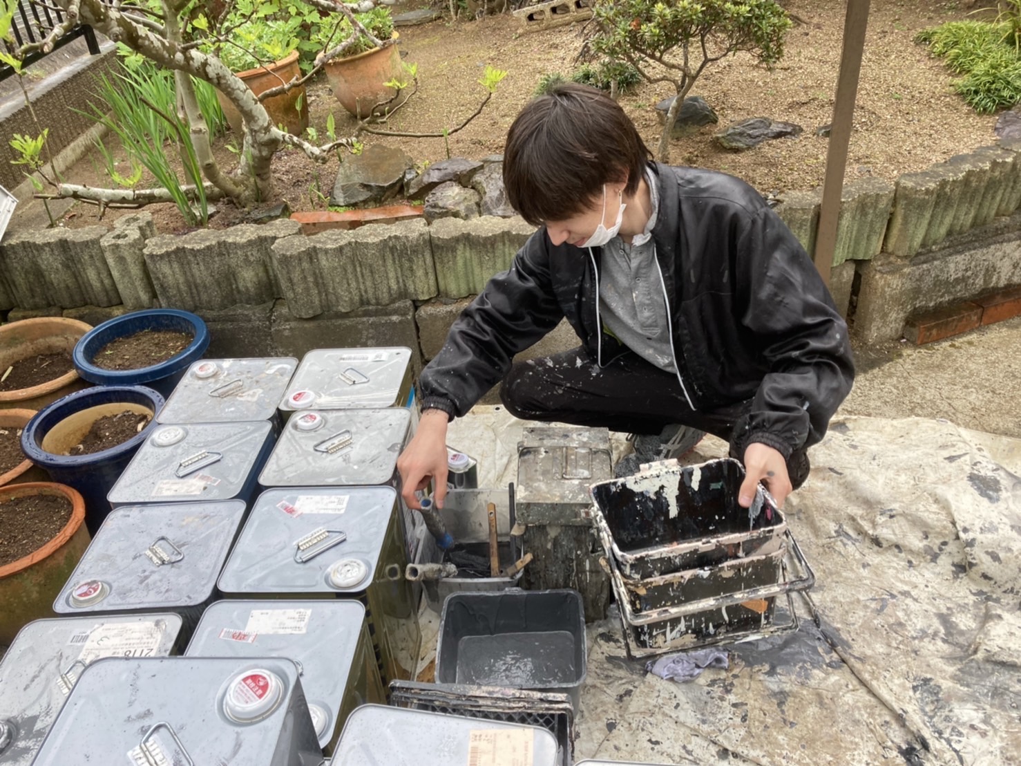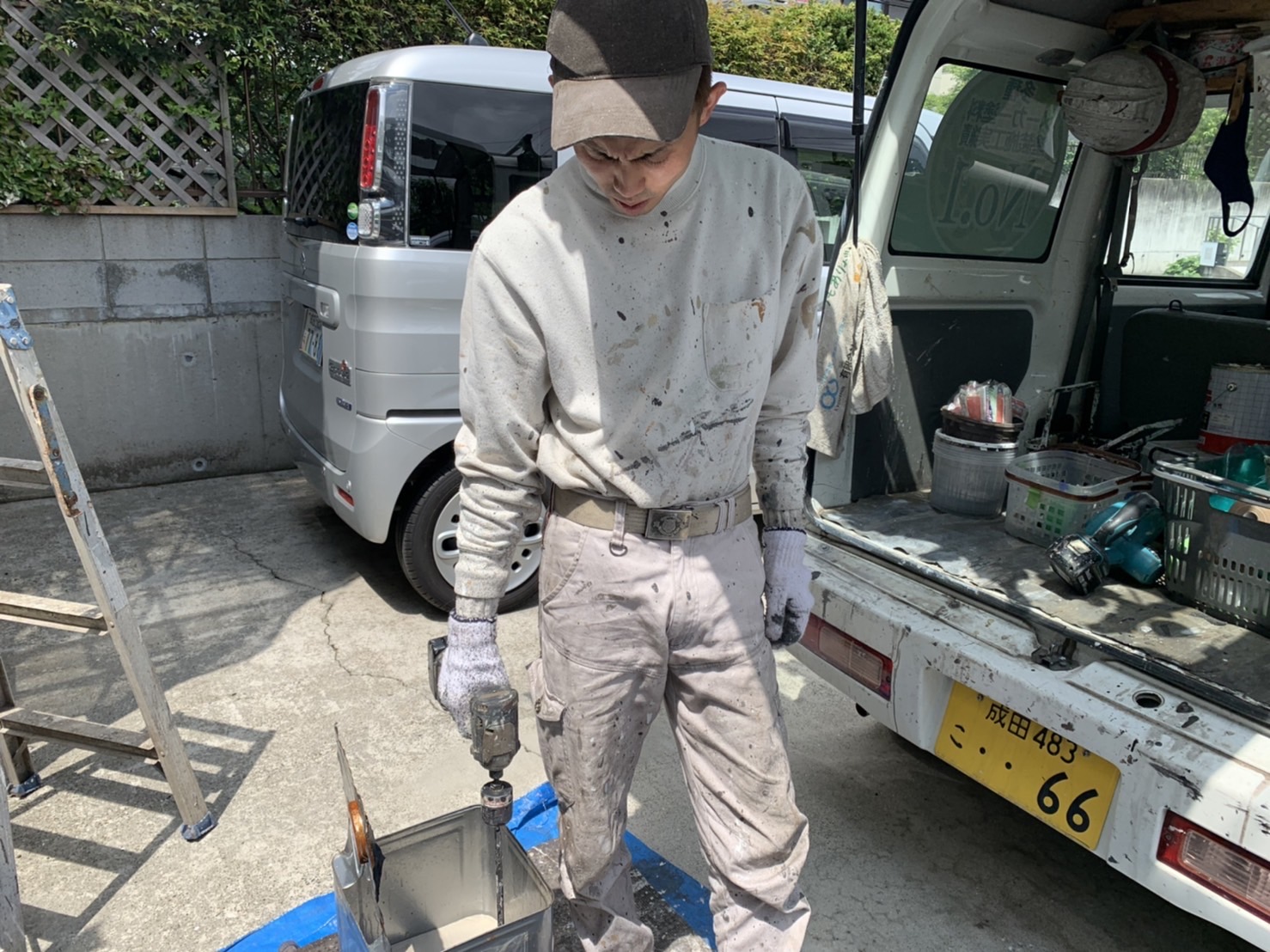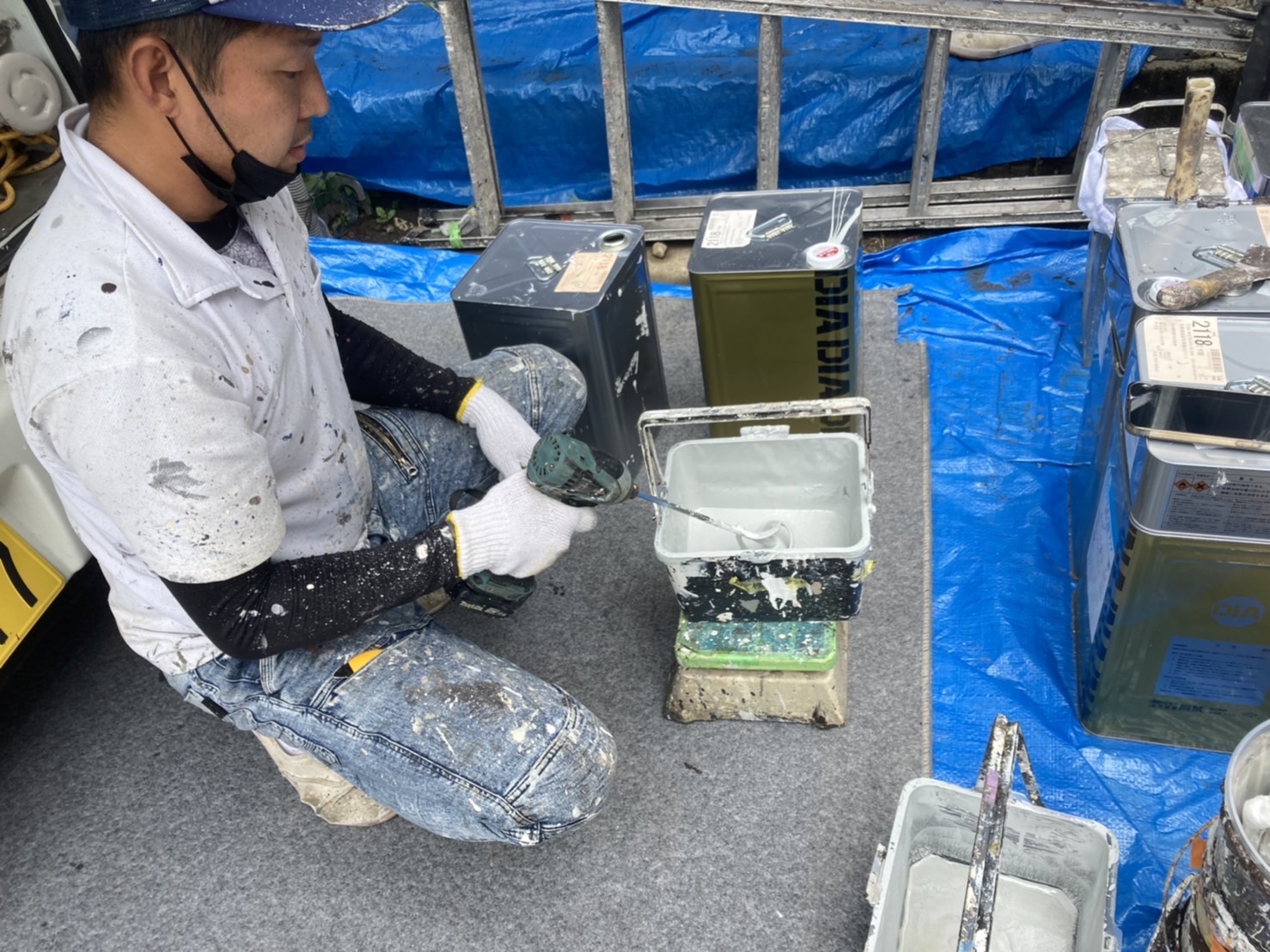 主剤と硬化剤をまんべんなく攪拌して規定量を守りながら材料をお客様のお家へ塗装を
