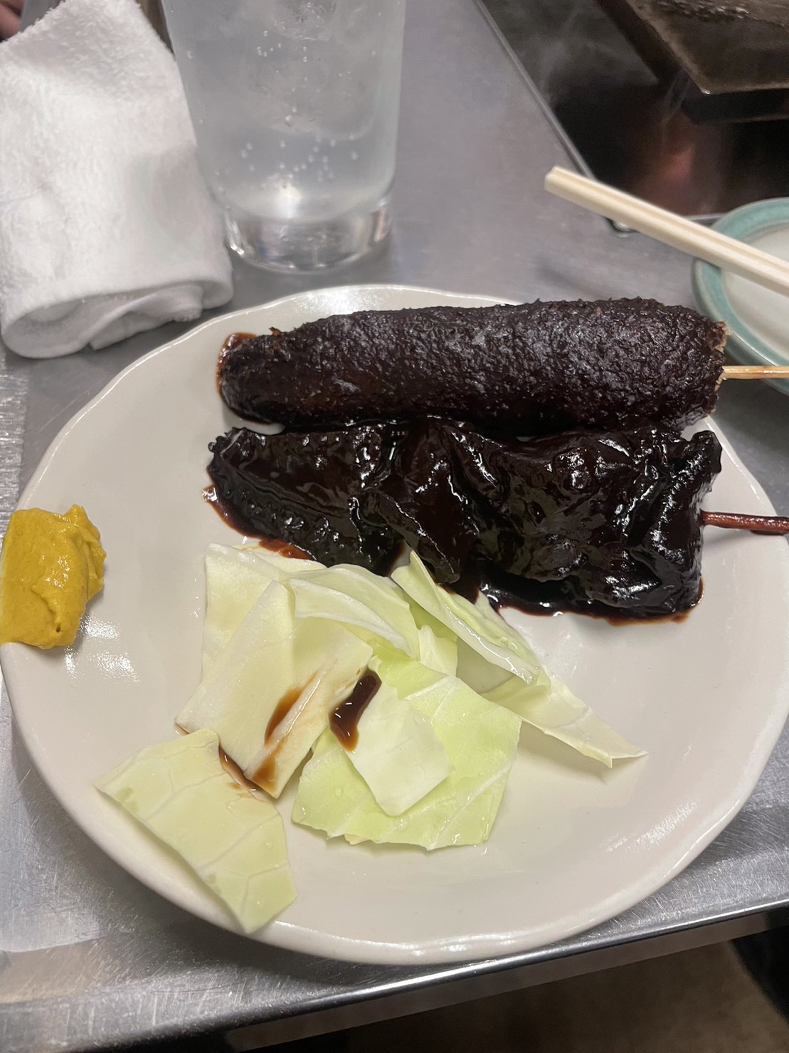 串焼きの黒味噌の味噌カツと赤味噌のホルモンも美味しくいただきました!