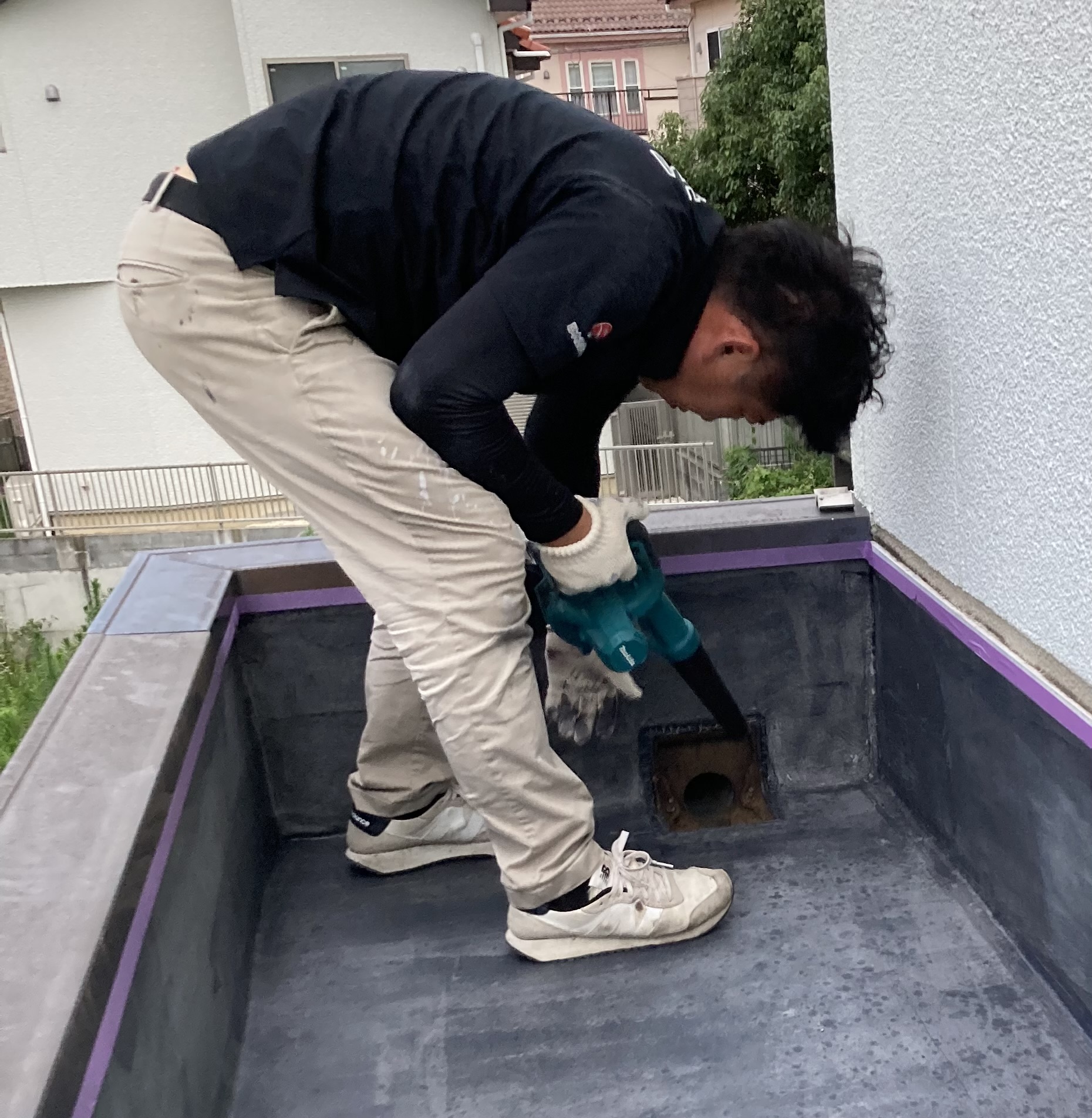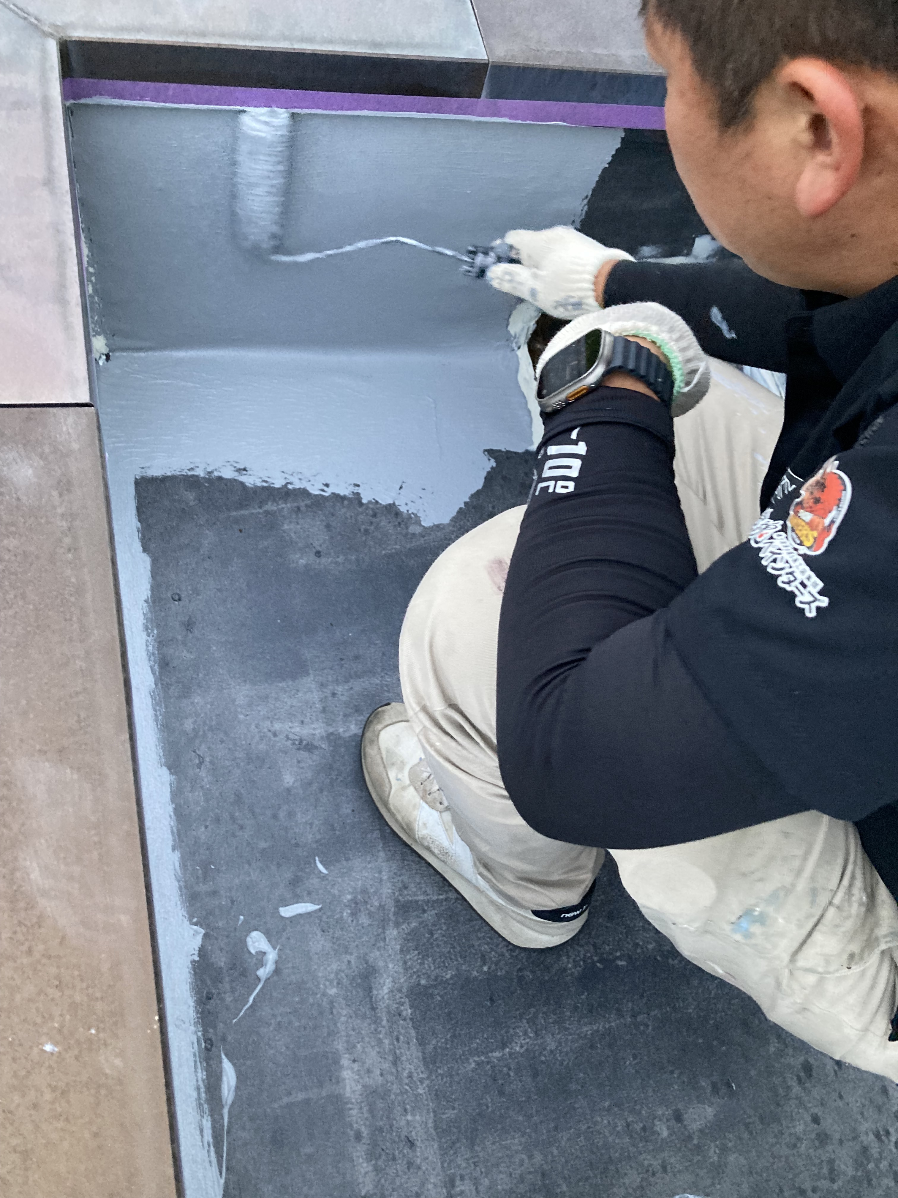 本日は防水工事をしてきました❗️ 防水塗料の下塗りをしたあとに曇りでなかなか乾かずブロアーを当てています💨