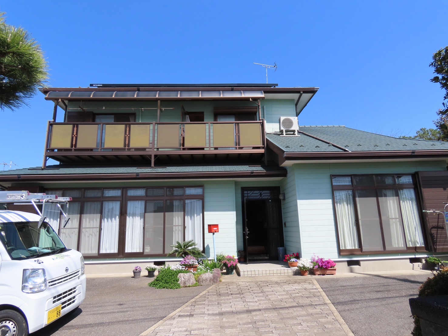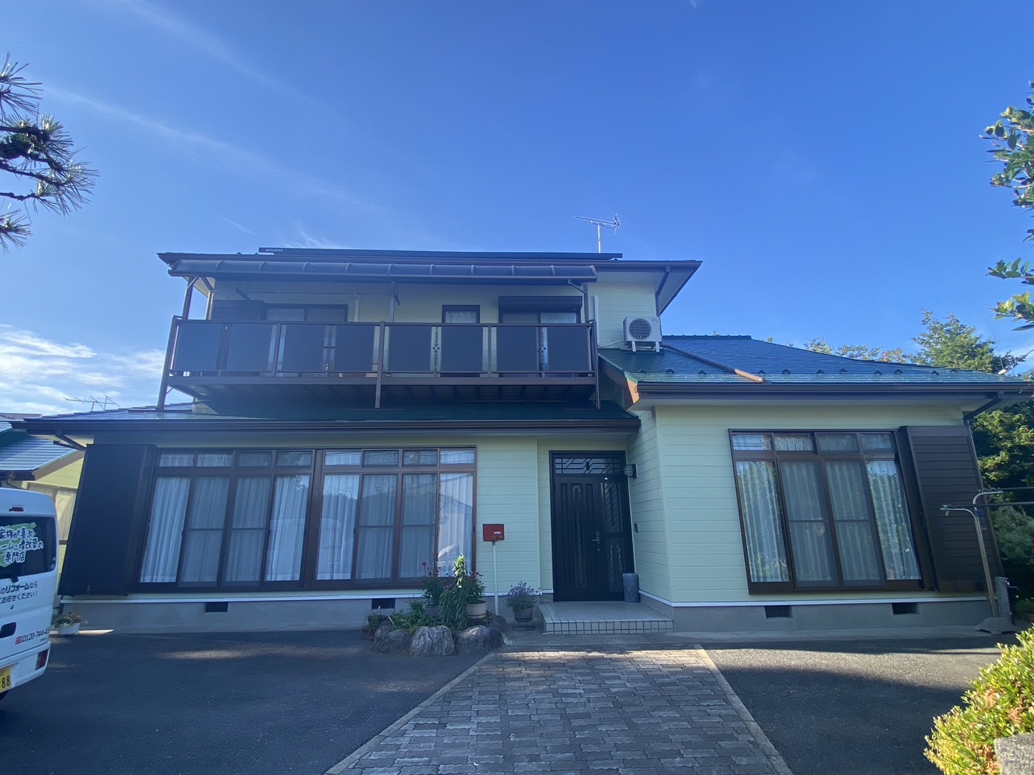 グリーンを基調とし、サッシのブラウンがアクセントのお家です🎵