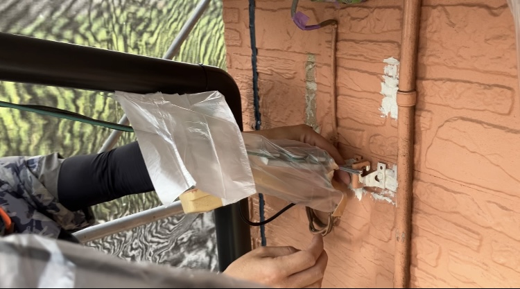 今回の現場では、外壁に設置されている配線や電気機器をしっかりと養生しながら作業を進めています✨