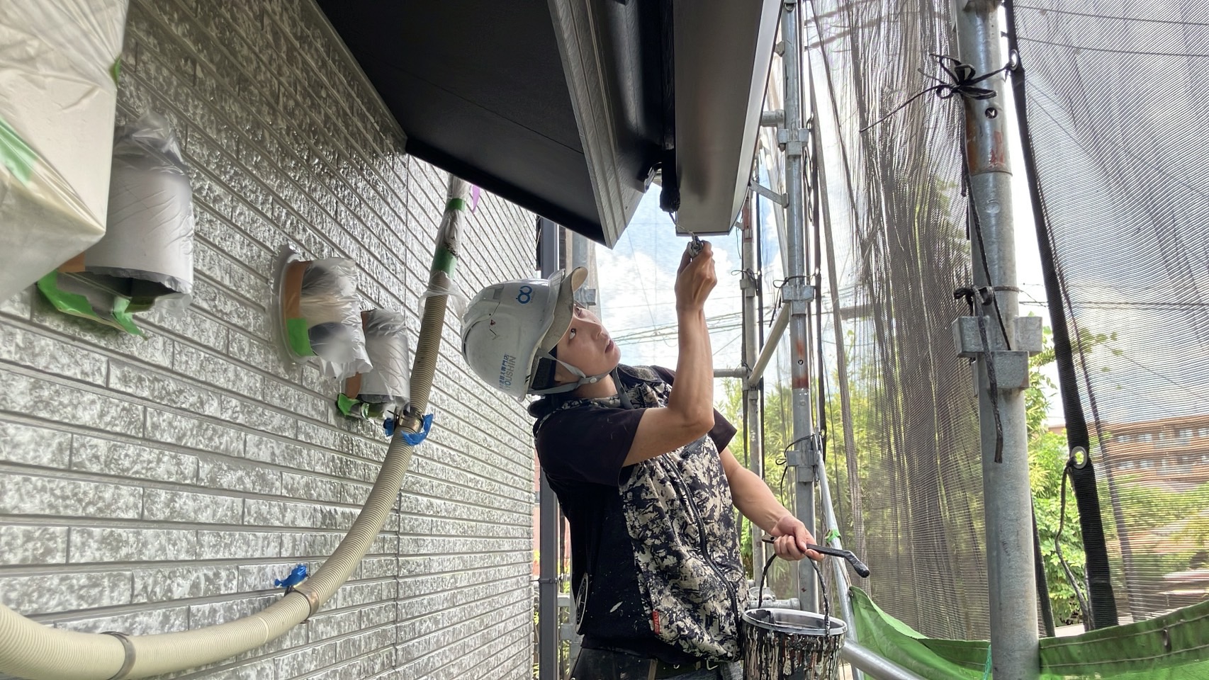 こちらのお写真は、鼻隠しと軒樋(のきどい)の隙間部分を丁寧に塗装している様子です🎨