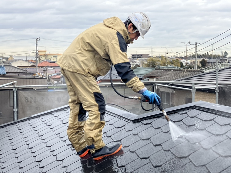 足場をしっかり設置し、下地調整やケレン作業を終えた後はいよいよ洗浄作業へ🚿✨