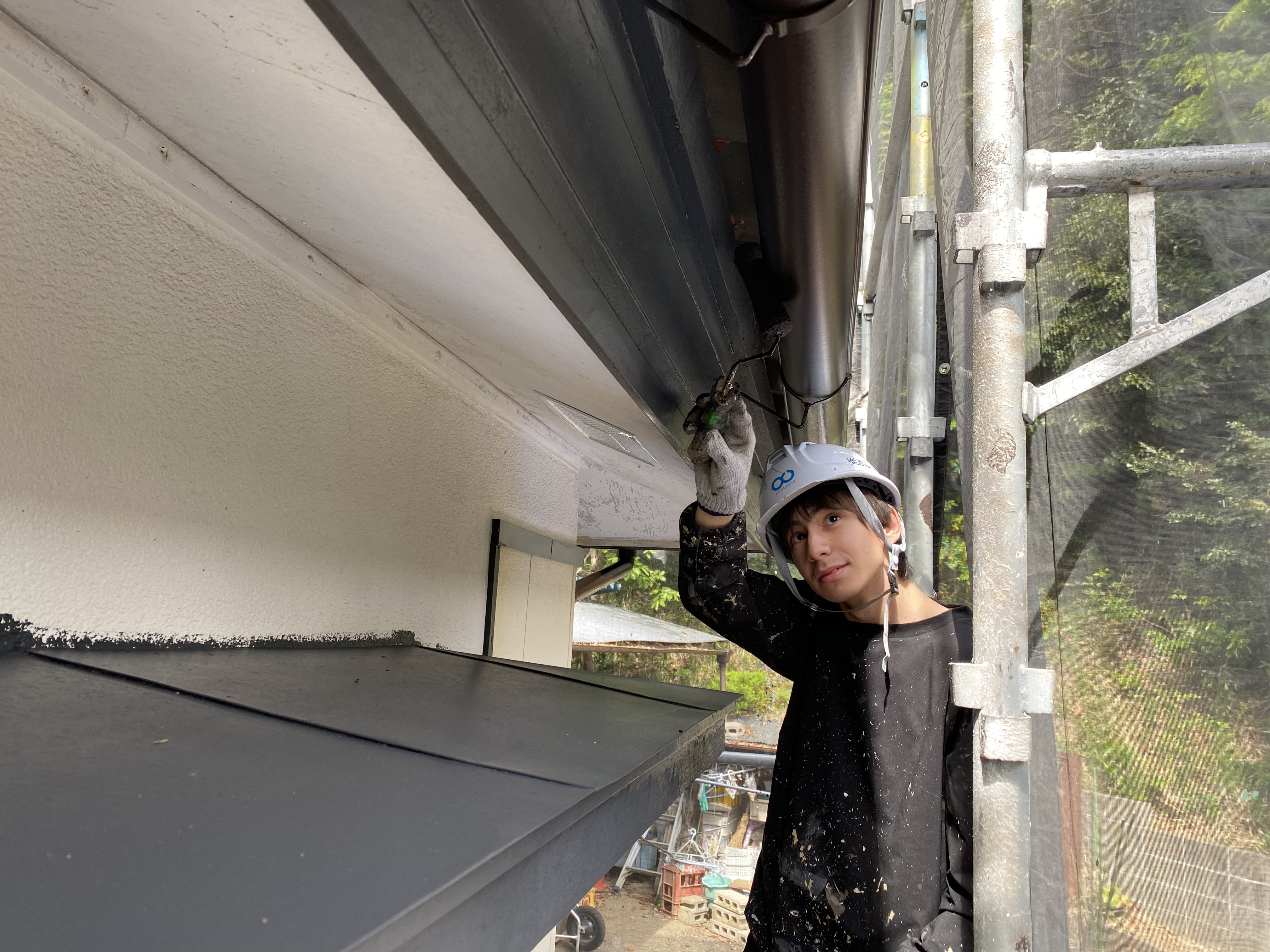現場確認に向かったところ、本日は付帯塗装中✨雨樋の塗り替えをしていました!