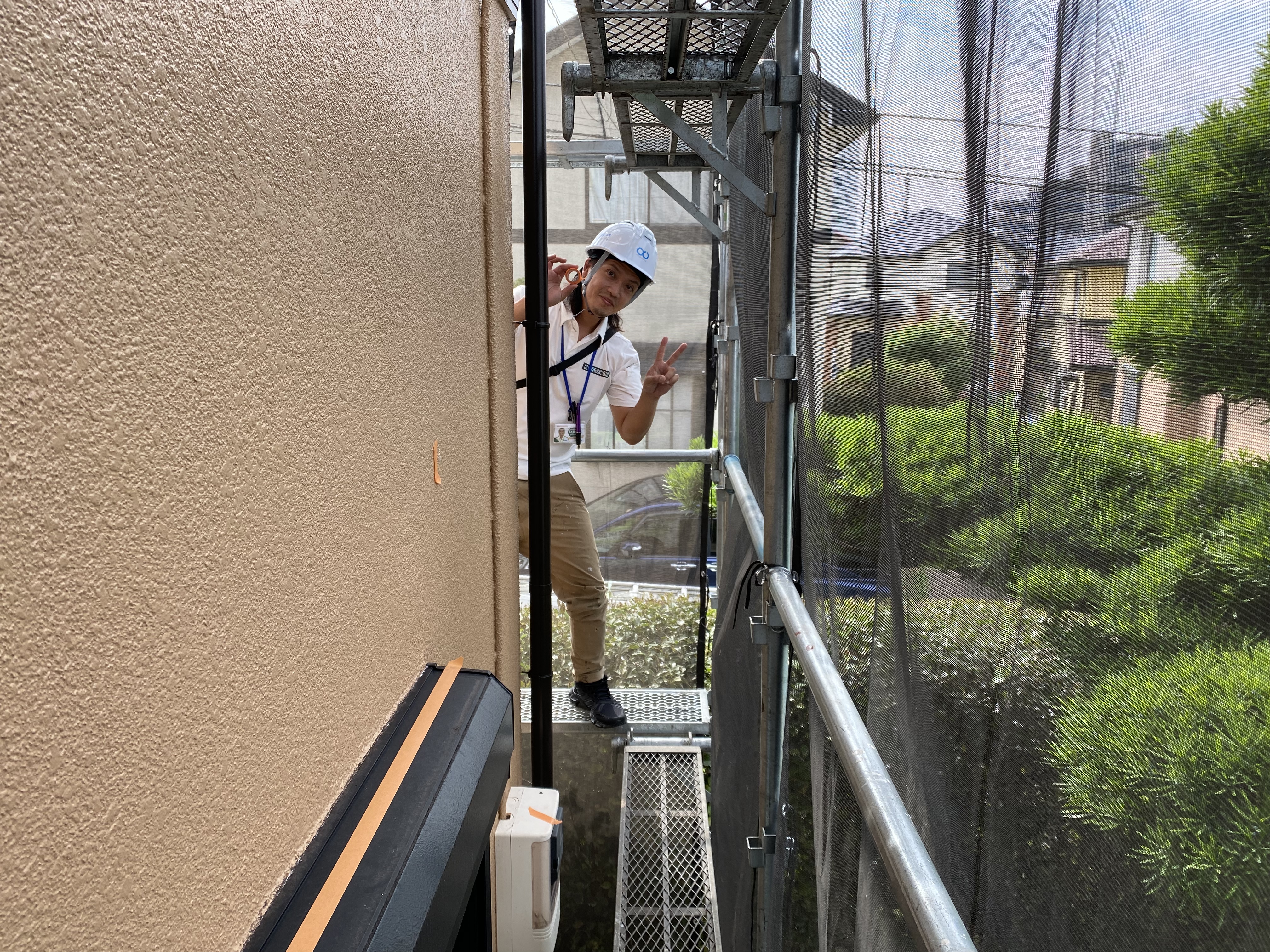 足場に登る前に、ヘルメットを装着します!