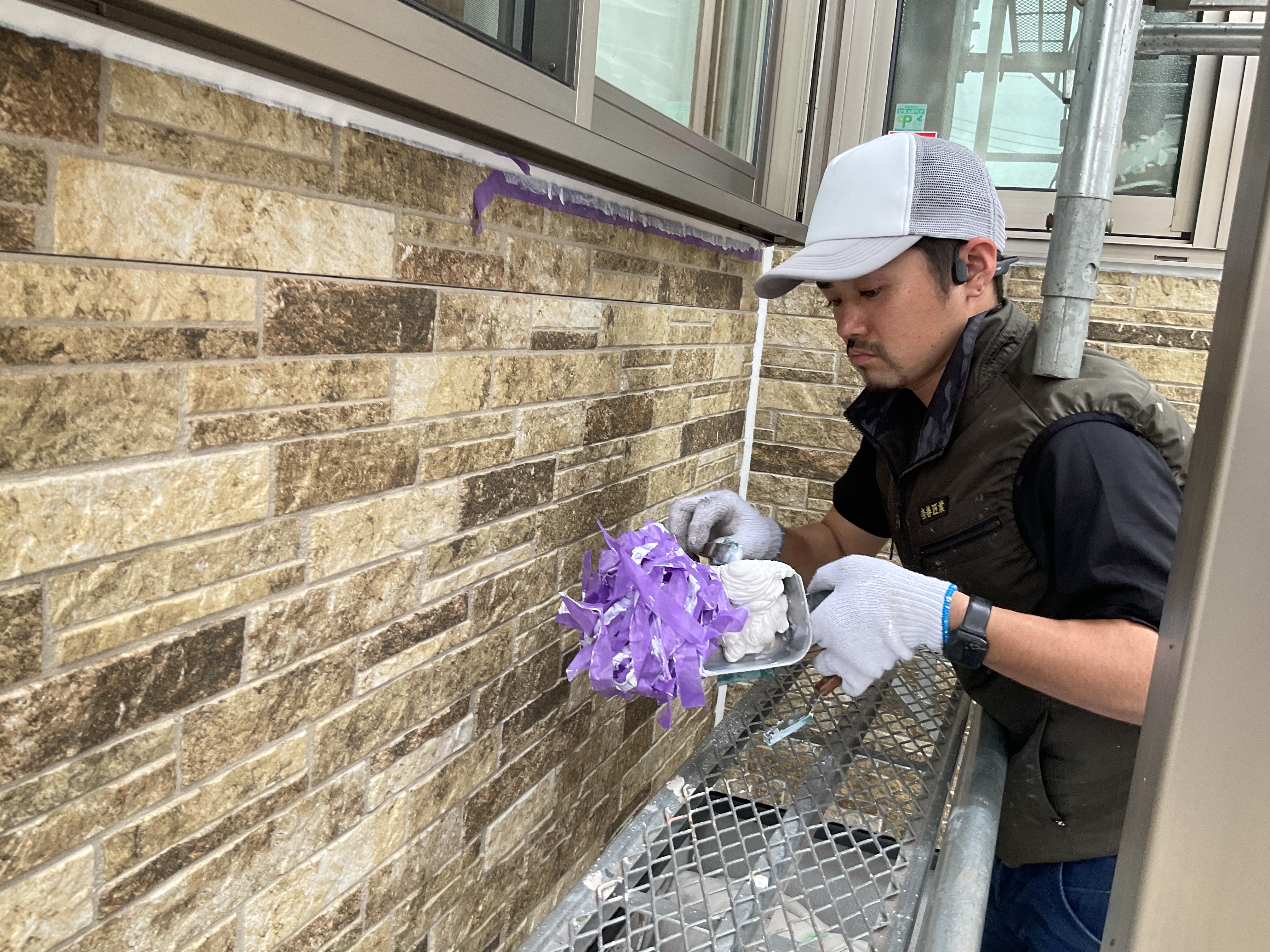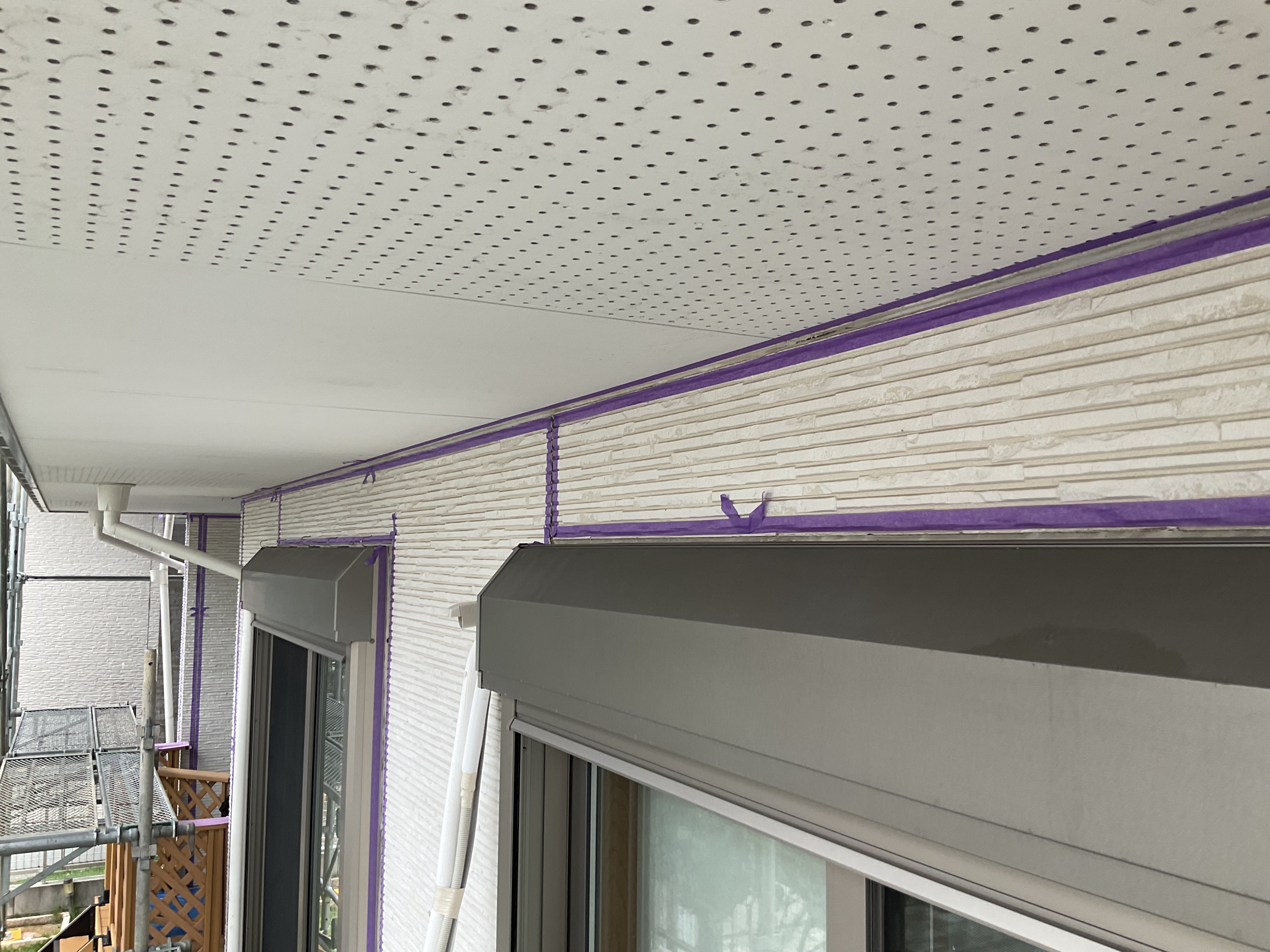 こちら古いシーリングを撤去し新しくシーリングを打つのにテープを貼って行きます(^^)/